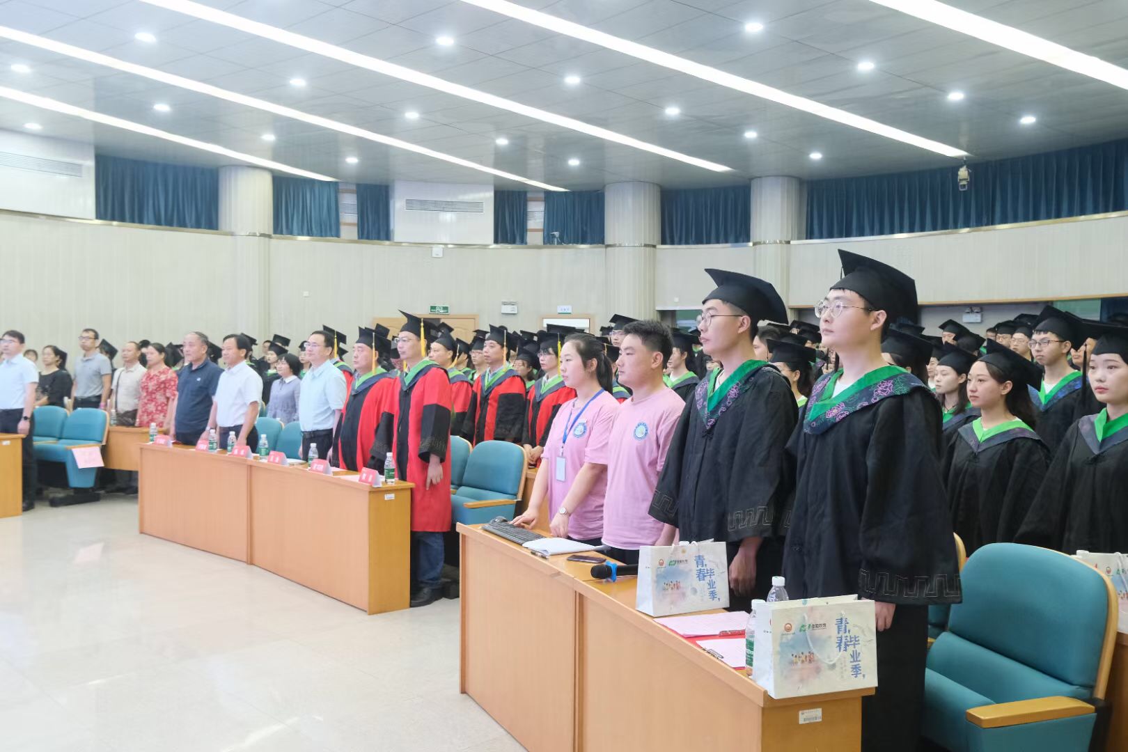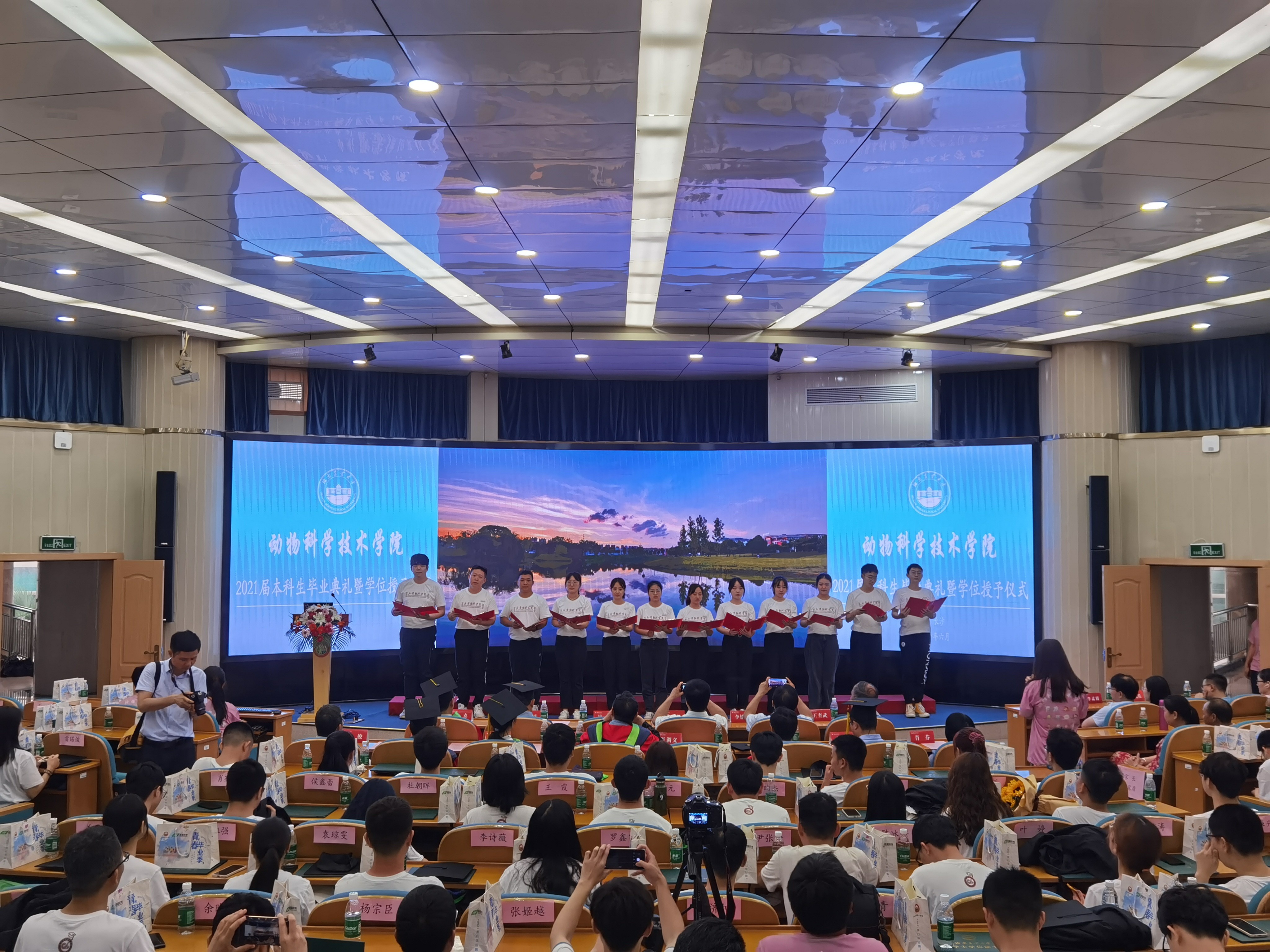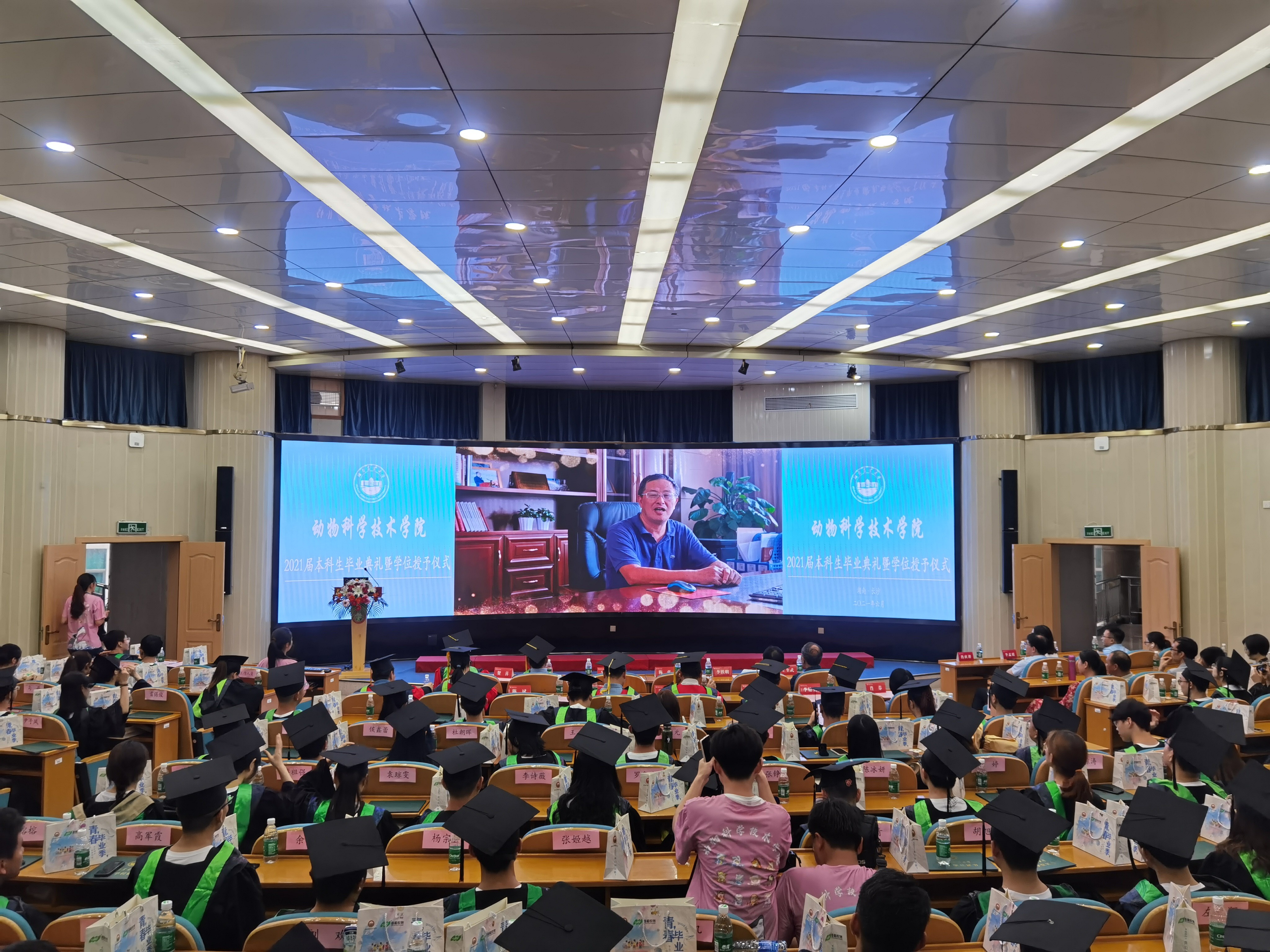 生科楼内人潮涌动,毕业典礼现场气氛庄严而热烈,全体师生共同回首过去,畅想未来,为即将离开母校的动科学子送上最真挚的祝福。