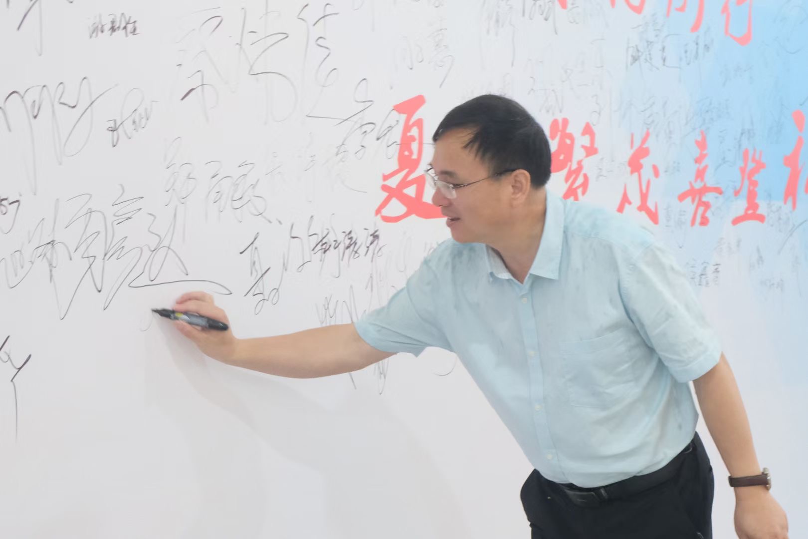 打卡签名墙。于党于国,今朝是最好的时代;于你于我,此刻是最美的年华。生科楼一楼大厅,毕业生拿起黑色的签字笔,将存在这里的美好记忆,伴随着自己的名字,写进毕业生签名墙里。