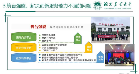 (2)实践中取得关键突破。通过“立志爱国兴牧、树立劳模榜样、创办英才讲坛”激发学生热爱服务产业;通过“学术圈、产业圈、国际圈”,建立“创新学堂、移动学堂和拔尖学堂”夯实专业理论;通过“教学科研平台、校企合作平台、国际交流平台”培养创新服务能力。取得“立心、厚识、强能”人才培养实践关键突破。
