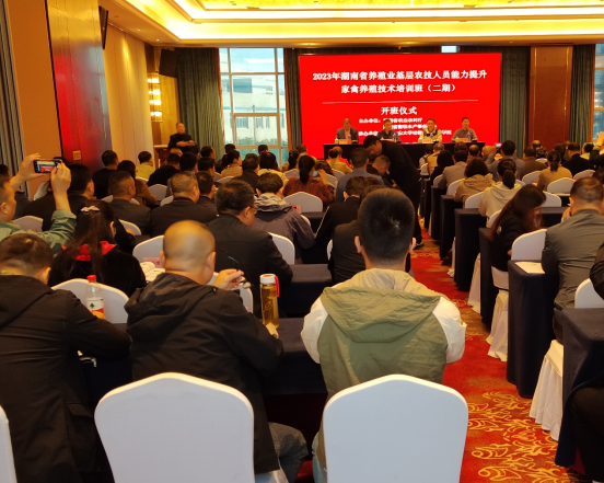 11月7日,2023年湖南省养殖业基层农技人员能力提升——家禽养殖技术培训班(二期)在长沙开班。省畜牧水产事务中心科技推广部部长黄亮、3044am永利官网院长贺喜、副院长何俊、湖南省畜牧兽医研究所蒋桂韬研究员出席开班仪式。各地州市相关基层农技人员等代表共105人参加培训。