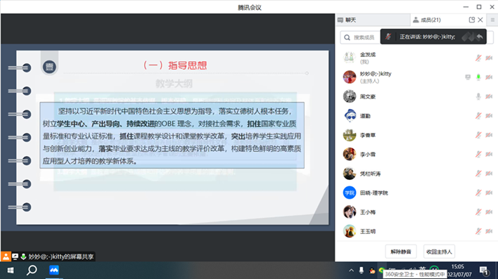 为进一步提高人才培养质量,加强课程思政建设,beat365英国官网网站物理教研室于2023年7月7日下午以线上会议方式,召开了2023版光电信息科学与工程专业教学大纲修订与编制研讨会。物理教研室全体成员参加了该会议,会议特邀了学院党总支书记胡红亮和丁琦副院长参加,金发成召集主持。