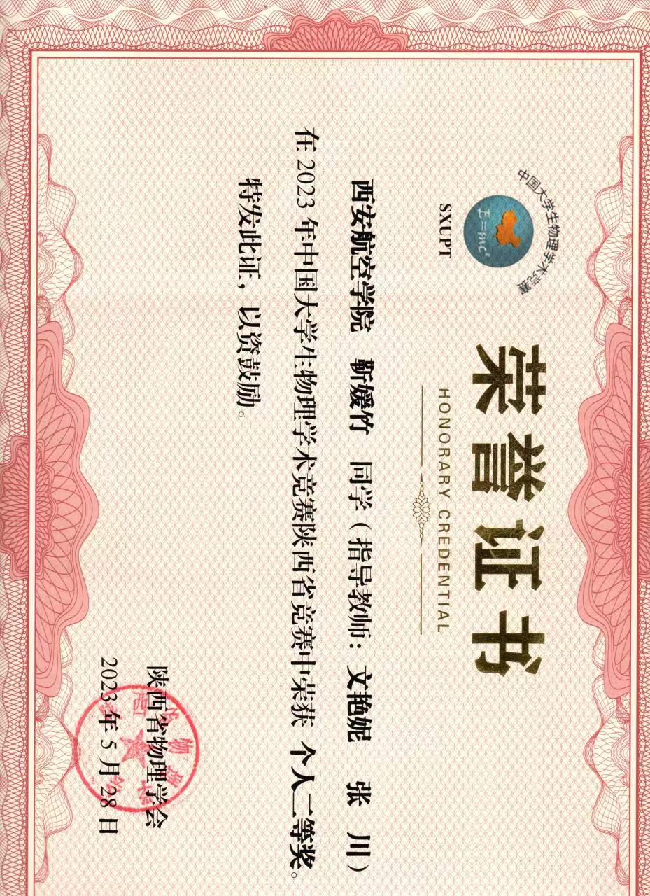 近日,由陕西师范大学承办的中国大学生物理学术竞赛(CUPT)陕西省赛(SXUPT)经过激烈角逐落下帷幕,beat365英国官网网站文艳妮和张川老师指导的光电信息212班靳媛竹同学不畏强手、勇于拼搏,荣获陕西省个人赛二等奖。