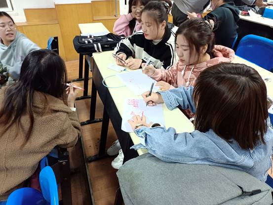 主持人首先介绍了本次活动的宗旨和活动规则,随后,心理部成员对五十名成员进行分组,并发放纸张和笔,每位同学画出自己想到的一个四字成语,并展示给同组成员,同组成员猜测答案。在规定的时间内,猜测成功次数最多的组别获胜。活动现场同学们发挥想象力,挥动画笔,画出他们心中多姿多彩的世界,比赛现场气氛活跃,伴随着紧张与刺激,将同学们的参与激情提到了高潮。