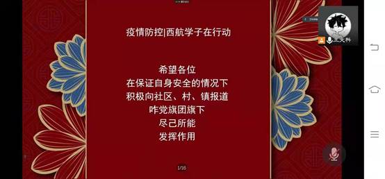 在会议过程中,更有已经参与到志愿防疫工作的团学干部讲述了自己的志愿经历与志愿故事,说出了自己在这场疫情防控阻击战中最直观的感受与体悟,“青年人所多的是生力,遇见深林,可以辟成平地,遇见旷野,可以栽种树木的,遇见沙漠,可以开掘井泉的”在挑战面前,青年们用实践证明自己有能力从先辈手中接来旗帜,扛起责任,奔向未来!