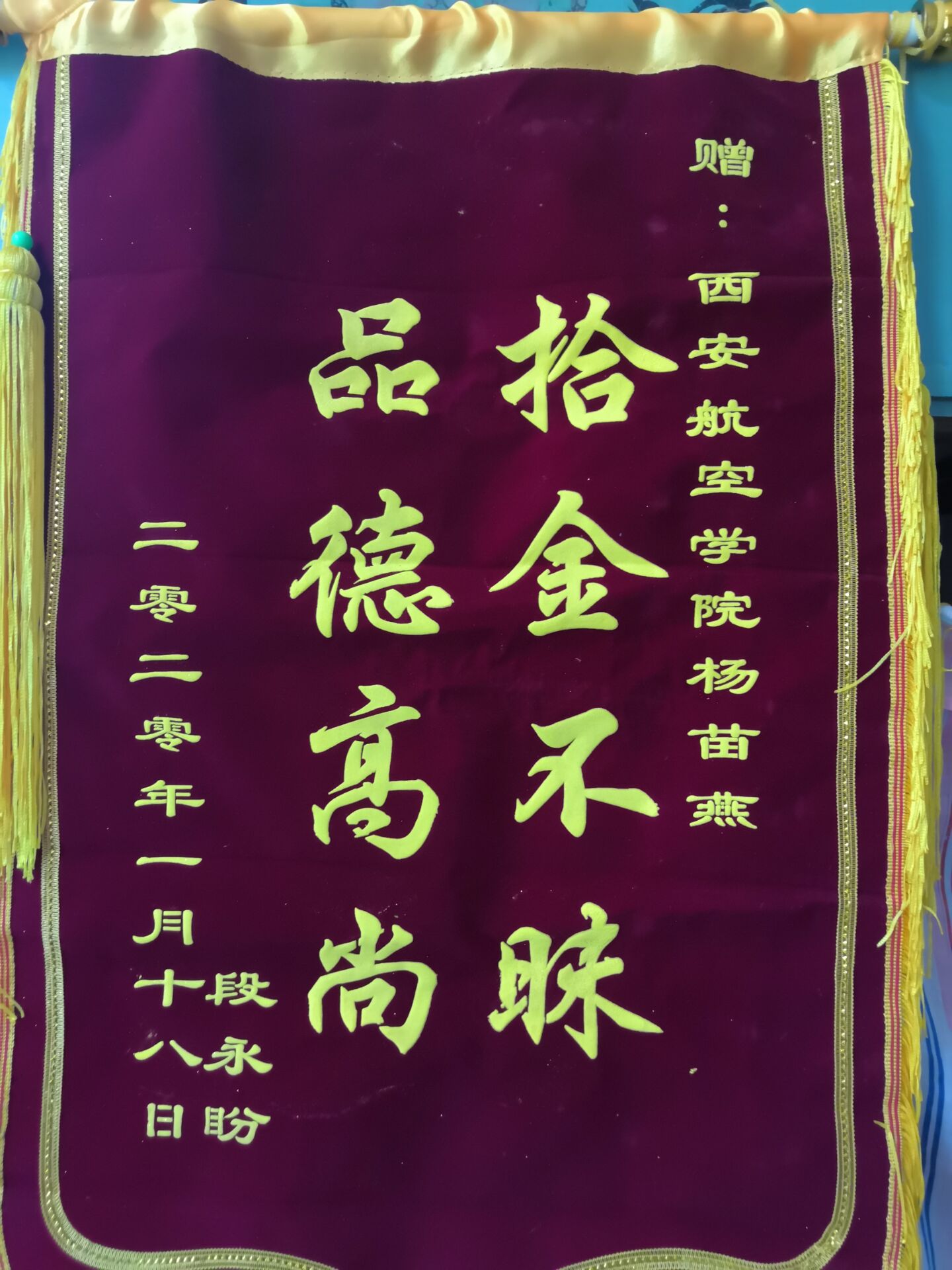 失主拿到丢失的东西后对杨苗燕同学的拾金不昧表示了高度的赞扬,杨苗燕同学做好事不留名失主第二次几经辗转才了解到杨苗燕同学所在村委的地址并赠送了这面锦旗,而这面锦旗在半年之后辗转转交到杨苗燕同学手上。