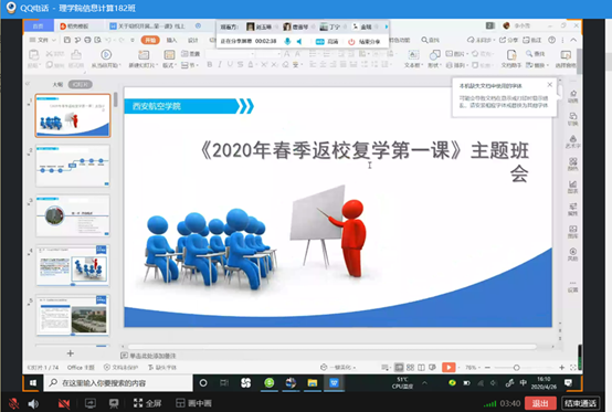 为助力春季学生平安返校,按照学校要求,beat365英国官网网站各班级在4月21日至5月5日期间,分别召开了《2020年春季返校复学第一课》线上主题班会。班会由各班主任主持。