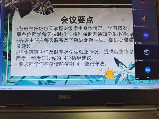 在我们全民防疫抗疫期间,更应该注重师生之间的交流。本次会议正向大家说明了这一点,即使教学工作受到了很大程度的阻碍,但大家的心是连接在一起的,希望疫情能早日结束。(文/光电信息181杨航 图/光电信息181唐紫怡)