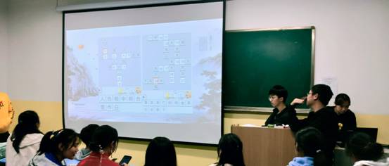 比赛分为小组制,参赛人员两人一组,总赛分为三轮,每轮抽签决定对战队伍。第一轮比字,两只队伍派一位成员,在给定相同偏旁部首下两分钟内写字,六组进入下一轮比赛。第二轮比成语,根据黑板上的成语填空,用时短的获胜,三组进入第三轮。第三轮比诗词,给定数字背诗或词,同学们积极踊跃的背诵古诗词,各个摩拳擦掌,颇有大将风范。