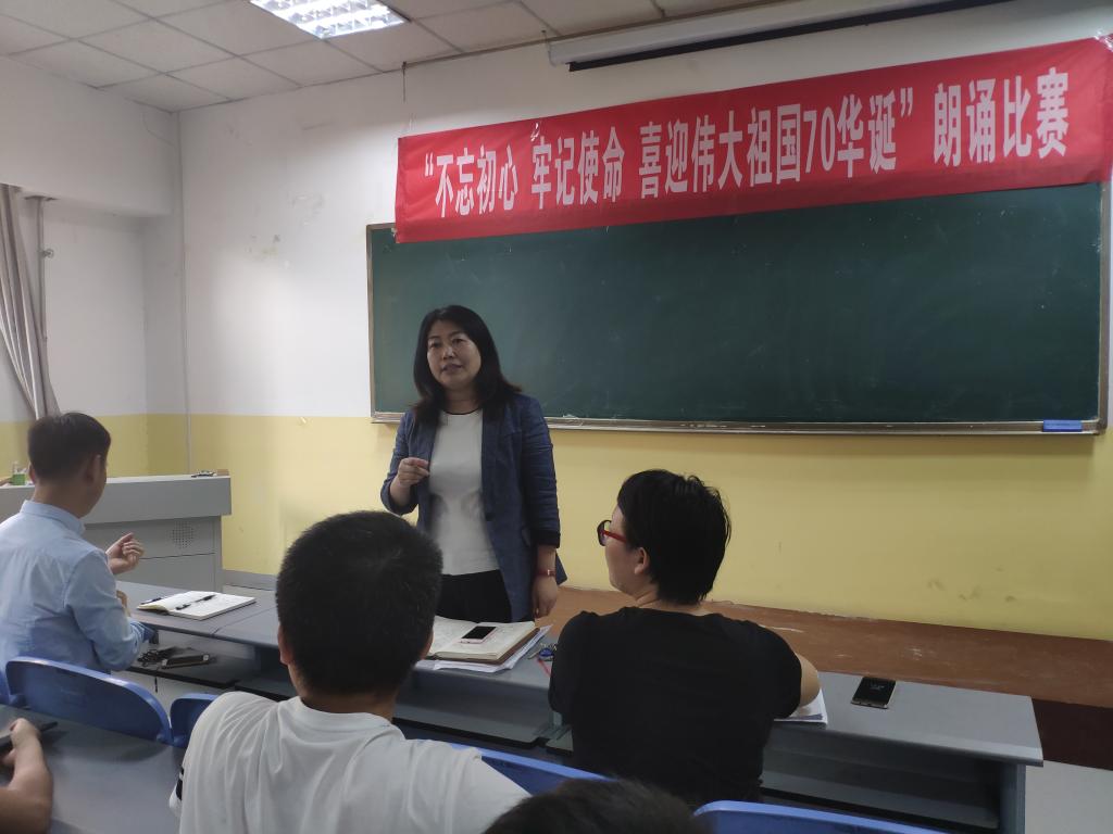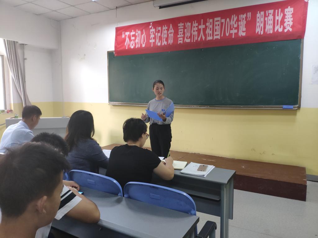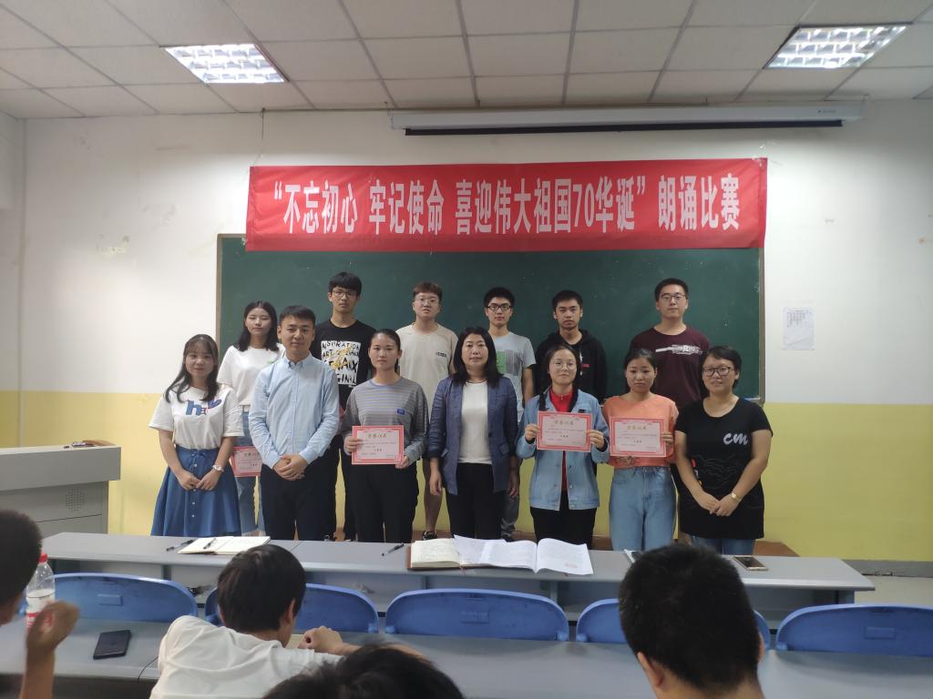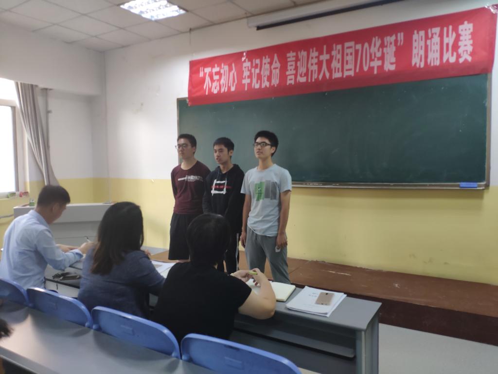 为庆祝中华人民共和国成立70周年,加强对学生爱国主义教育,2019年9月26号至29号,beat365英国官网网站在南楼408举办了“不忘初心,牢记使命,喜迎伟大祖国70华诞”主题朗诵大赛。beat365英国官网网站各班级均派出学生代表参加,共12支代表队参加了比赛。朗诵大赛评委为beat365英国官网网站党总支书记李小光、学生管理科科长李扬,团总支书记杨陈东及学生会部分干部。观众为所有大一新生。
