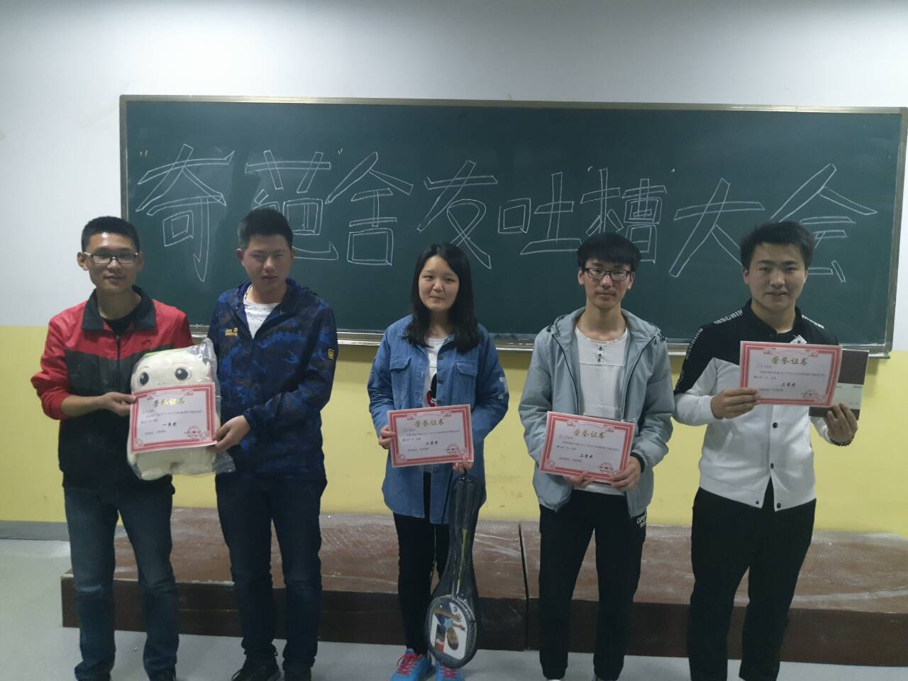 beat365英国官网网站团总支书记、辅导员杨陈东,学生分会主席刘亚军,学生分会副主席艾柏宇,团总支副书记秦薇以及大三优秀学生代表曹林超担任评委。活动设置宿舍吐槽,评委点评和颁奖三个环节。首先,选手们依次上台对舍友进行吐槽和自嘲,选手们的幽默风趣引来阵阵掌声和笑声。经过激烈的角逐,李和庆和贾永峰组合获得一等奖,吴青青获得二等奖,杨文超和严东东获得三等奖。