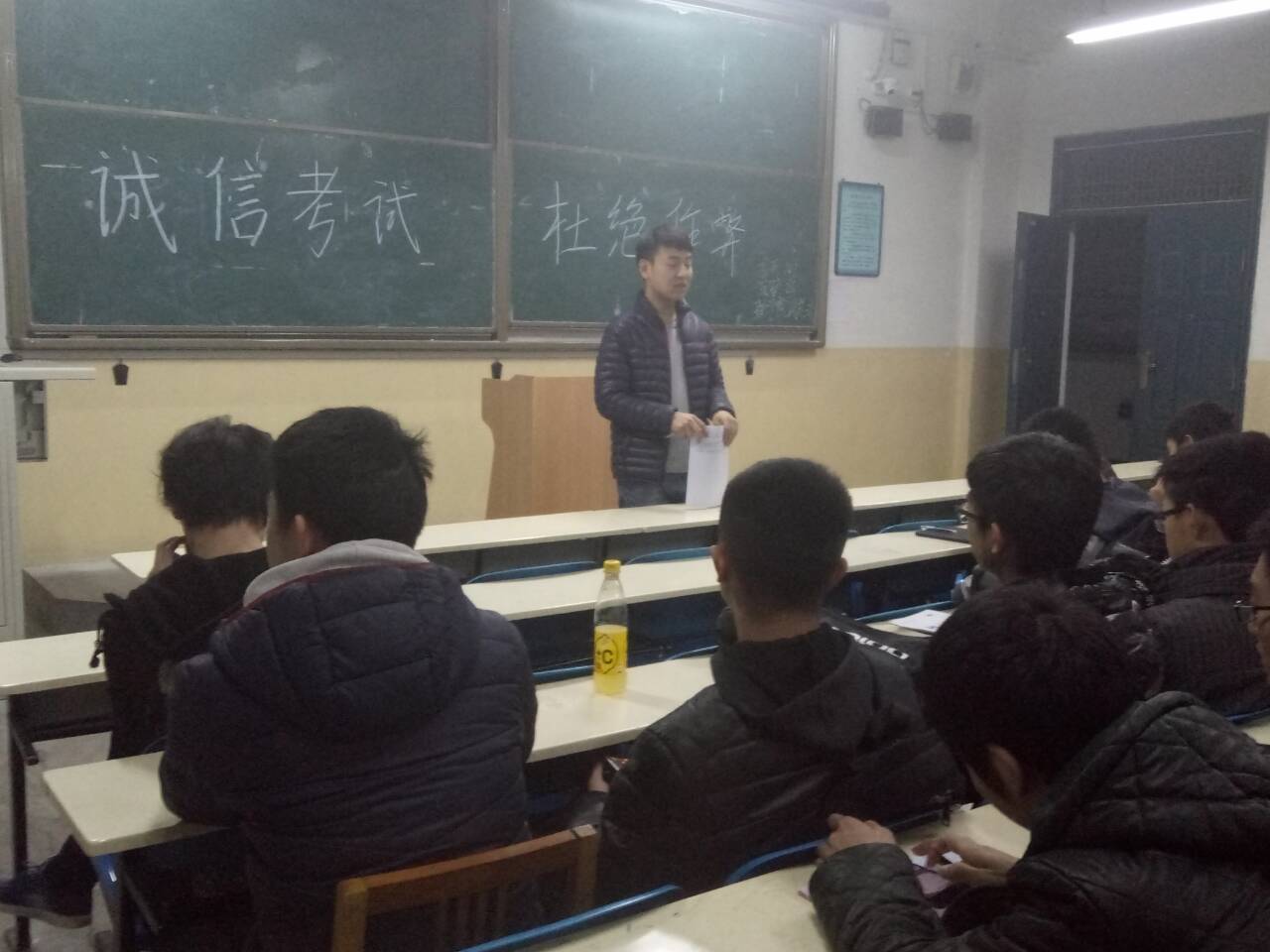 期末考试临近,为贯彻学校有关严肃考风考纪的相关规定,营造优良学风,2016年12月14日晚7点,beat365英国官网网站于主教学楼0114教室召开“诚信考试,杜绝作弊”主题班会,本次班会由beat365英国官网网站团总支书记兼辅导员杨陈东主持,beat365英国官网网站全体学生参加了此次班会。