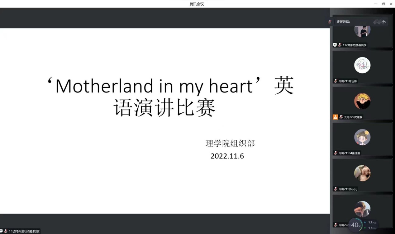 为提高学生英语演讲水平,丰富同学们的课余生活,激发同学们的学习热情,2022年11月6日,beat365英国官网网站以线上形式组织了以‘The motherland in my heart’为主题的英语演讲比赛,beat365英国官网网站大一大二13名同学参加,活动由沈惠瀛主持。