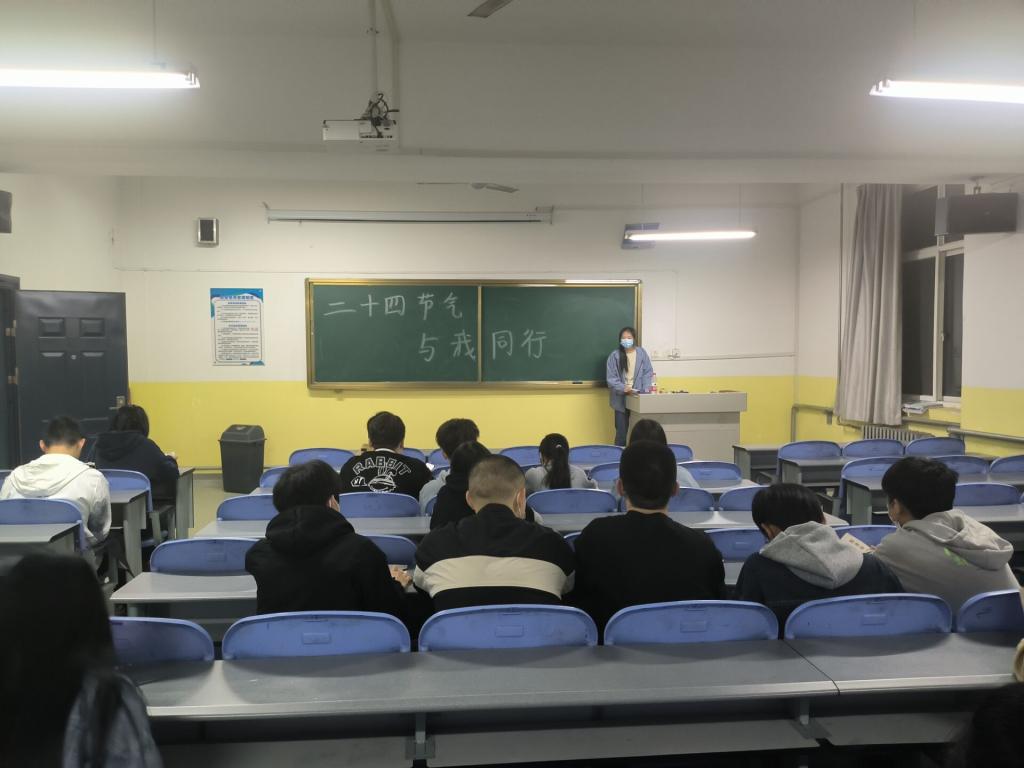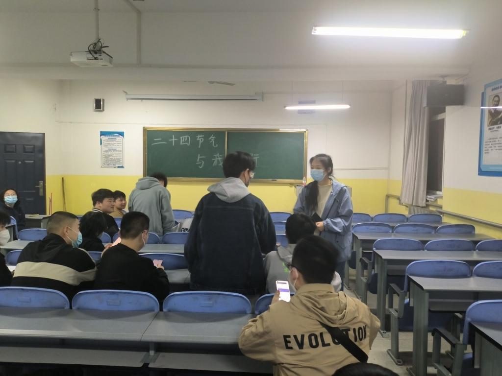 为普及传统文化,传播传统文化思想,弘扬文化精神,引导同学树立传统文化意识。2023年3月15日,beat365英国官网网站在南楼233教室开展了“二十四节气与我同行”文化宣传活动。beat365英国官网网站30余名学生参加了本次活动,活动由姜子娟主持。