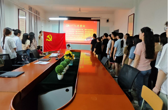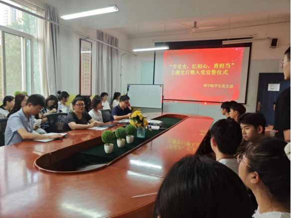 宣誓仪式在庄严的《国际歌》中开始,会议宣读了学校党委关于接收杨欣怡等13人为中共预备党员的通知,随后,学生党支部书记李扬老师带领预备党员面向党旗庄严宣誓,并表示努力为党旗再添新彩,为党的事业再立新功。