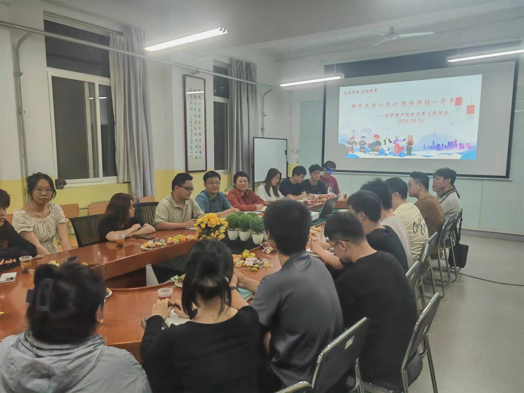 在中华人民共和国成立75周年来临之际,为深入了解少数民族学生的学习和生活状况,增进各民族学生间的交流与融合,beat365英国官网网站于9月26日晚举办了“携手共话心连心,民族团结一家亲”少数民族学生座谈会,beat365英国官网网站党总支书记胡红亮、学工办主任李扬、团总支书记王向阳、辅导员张岩、曾妍及来自藏族、回族、壮族等20余名少数民族学生参加座谈会。