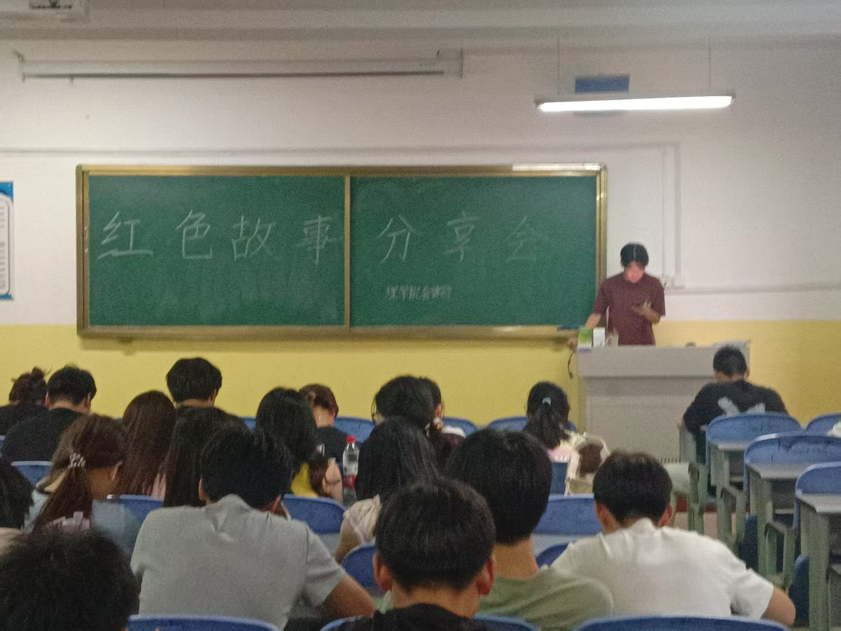 活动现场,同学们轮流上台分享自己了解的红色故事。光电232张渠讲述了刘胡兰英勇就义、狼牙山五壮士跳崖明志,展现革命年代先辈为信仰献身的无畏精神;信计242薛哲通过“龙潭三杰”钱壮飞、李克农传递情报力挽狂澜的历史事件,解密隐蔽战线的生死较量;信计241陈佳萱则聚焦社会主义建设时期,讲述焦裕禄治沙、王进喜“铁人精神”、钱学森突破技术封锁等故事,诠释艰苦奋斗的时代内涵。现场同学们全情投入,以热烈掌声回应每一位讲述者,现场气氛庄重而热烈,红色基因也在这一次次讲述中深植于每一位同学心间。