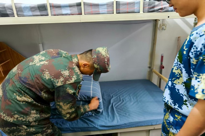 2025级新生军训内务比拼火热开展,以“叠军被、整内务”为核心,在宿舍方寸之间展开了一场“细节较量”。评委团依据“军被方正、床单平整、物品有序、地面整洁”的标准逐一打分。走进宿舍,只见“豆腐块”军被棱角分明,床单平整无褶,物品统一朝向、井然有序,地面洁净清爽。部分宿舍表现尤为亮眼,军被线条笔直如刀切,物品对称划一,展现出扎实的训练成果。