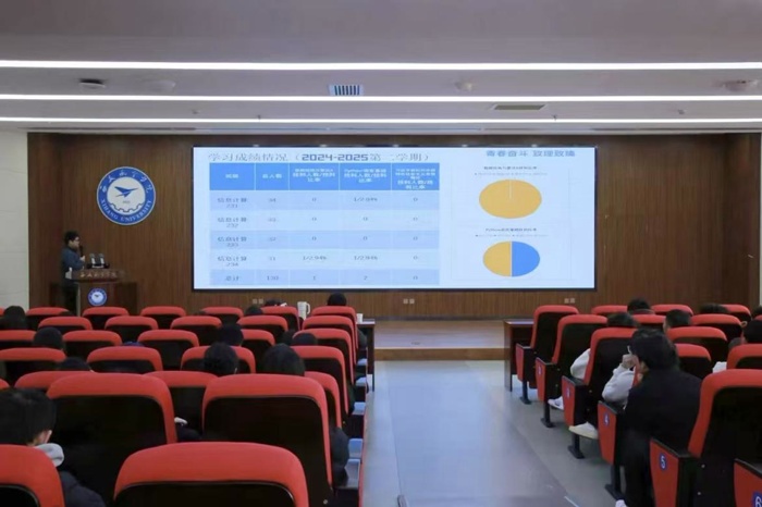王向阳围绕各专业人才培养方案,以详实的数据大三学生上一学年的整体学习成绩进行了多维度、深层次的剖析。不仅展示了各专业的平均绩点、优秀率、预警情况等宏观数据,还结合英语四六级通过率、学科竞赛参与度等指标,精准指出了当前学业发展的优势与短板。他强调大三学年是专业知识体系构建与深化的重要阶段,同学们需基于客观数据审视自身,查漏补缺,筑牢专业根基。
