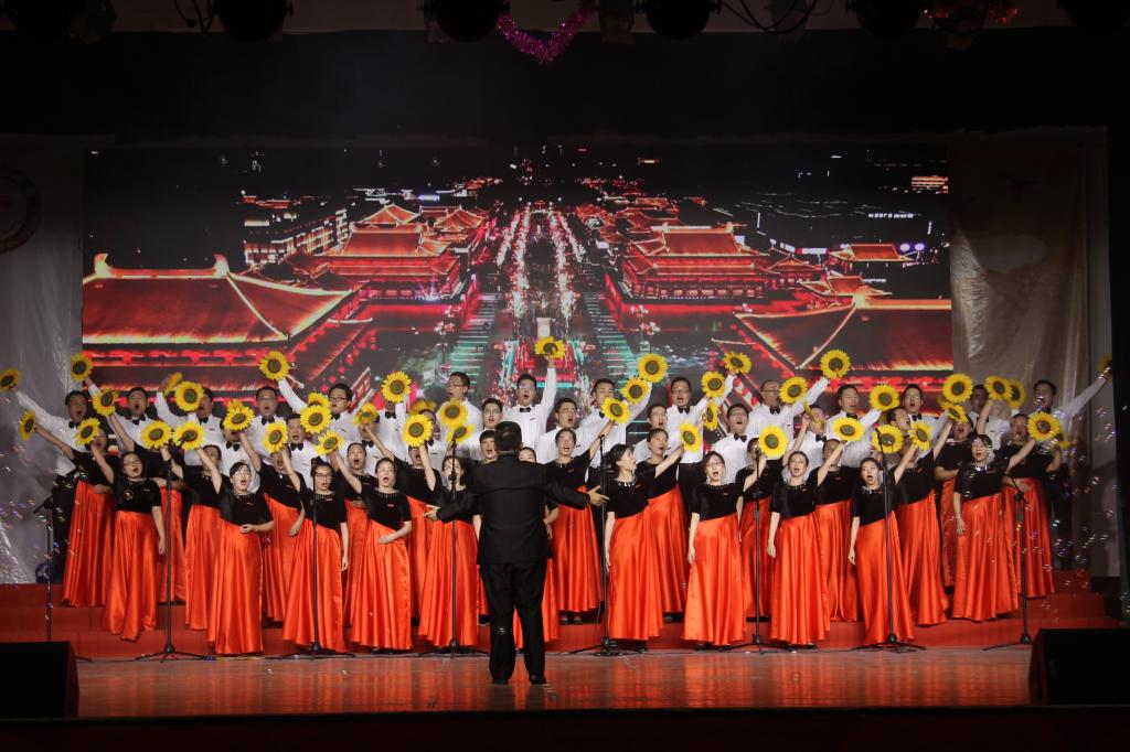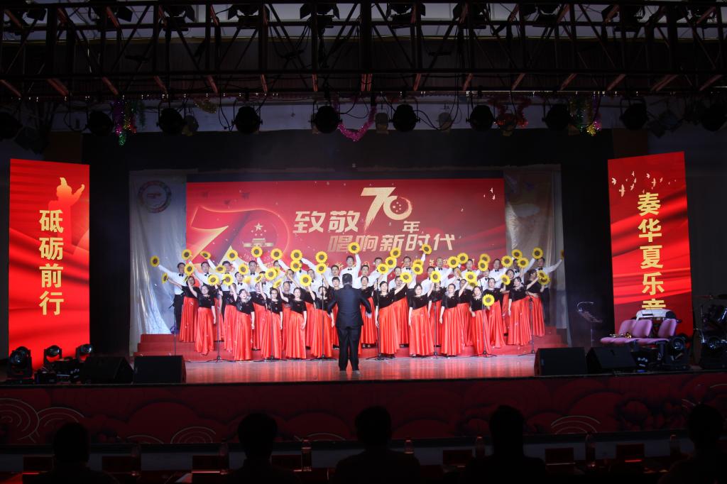 当音乐声缓缓响起,历经数周辛苦排练的全体教职工在胡宸铭教练的指挥下,用铿锵有力和饱含深情的声音娓娓唱响对祖国的热爱之情,整齐的节奏,悦耳的和声,动情的朗诵,精彩表现赢得了观众的共鸣与掌声。