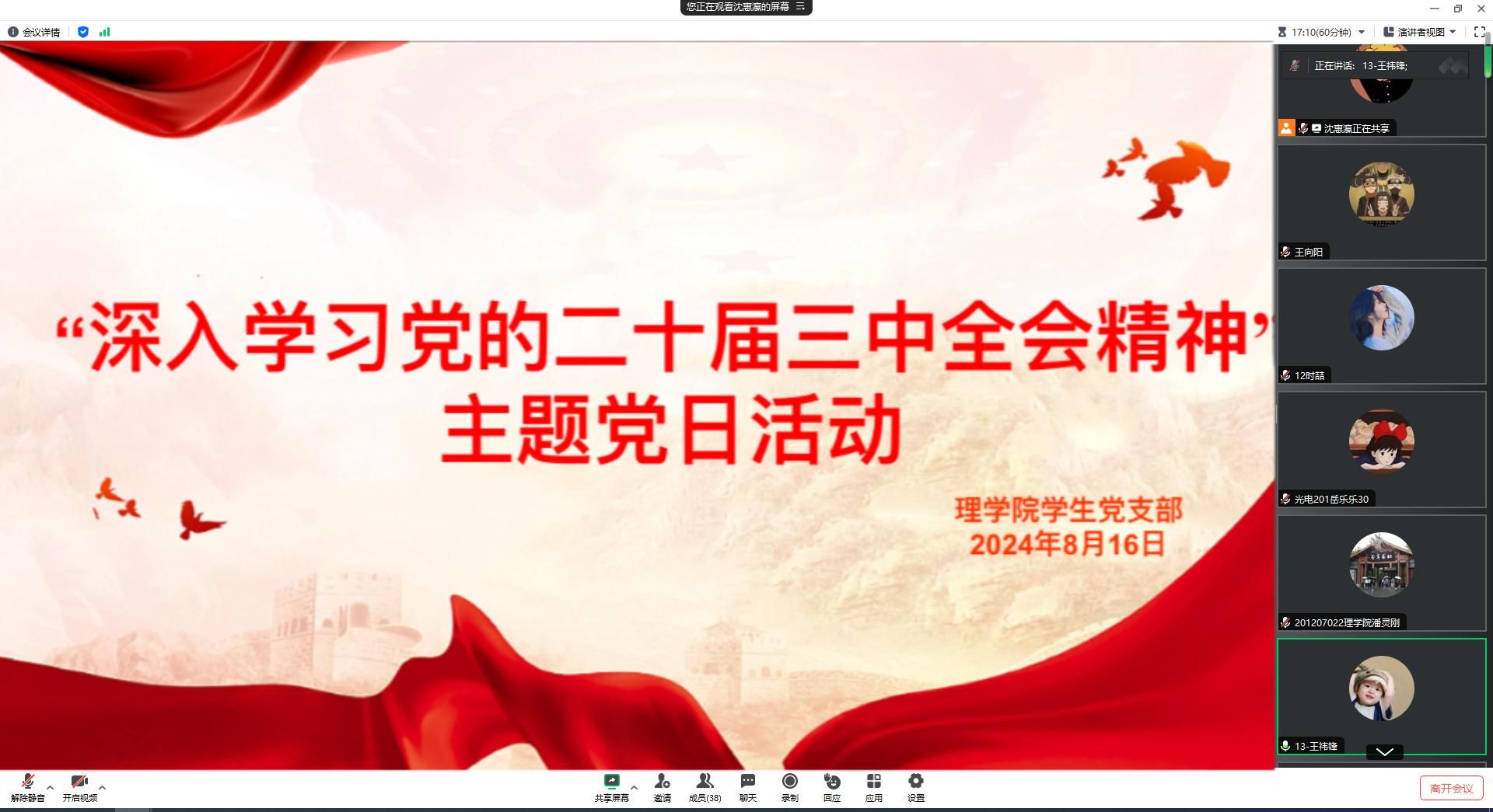 为深入学习宣传和贯彻落实党的二十届三中全会精神,2024年8月16日,beat365英国官网网站学生党支部于线上开展“深入学习党的二十届三中全会精神”主题党日活动。活动由支部书记李扬主持并领学,教师党员王向阳、曾妍、张岩以及支部全体学生党员参加本次学习。