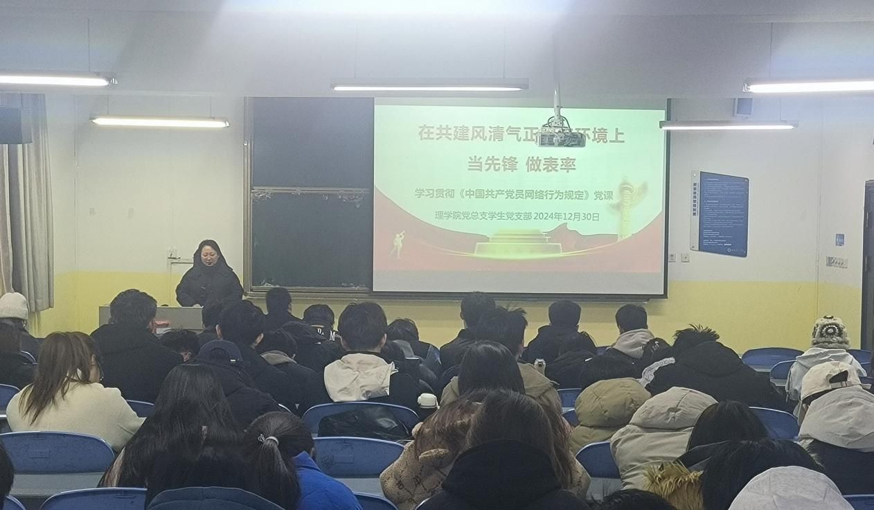 活动伊始,在组织委员王向阳的带领下,学生党员回顾总结2024。党员代表分享了在学业帮扶、志愿服务、校园文化建设等方面的成果。在学业帮扶中,成绩优异的党员同志主动为学习困难的同学答疑解惑,助力他们在知识的海洋中破浪前行,不少同学的成绩因此取得了显著进步;在志愿服务里,无论是校园环境清洁、图书馆整理,还是青年志愿者服务基地关爱离退休职工,都有他们忙碌且坚定的身影,那一次次贴心的陪伴、一堂堂生动的授课,传递着爱与关怀。随后支部书记李扬领学了《中国共产党员网络行为规定》相关内容,并为全体党员及积极分子讲授了题为“在共建风清气正网络环境上当先锋做表率”的主题党课。最后李扬强调全体同学要以此次活动为契机,将查漏补缺融入日常学习生活中,不断自我完善,自我提升,同时要将党的二十大精神和党的二十届三中全会精神内化于心、外化于行,以实际行动践行党的宗旨,为支部发展贡献力量。