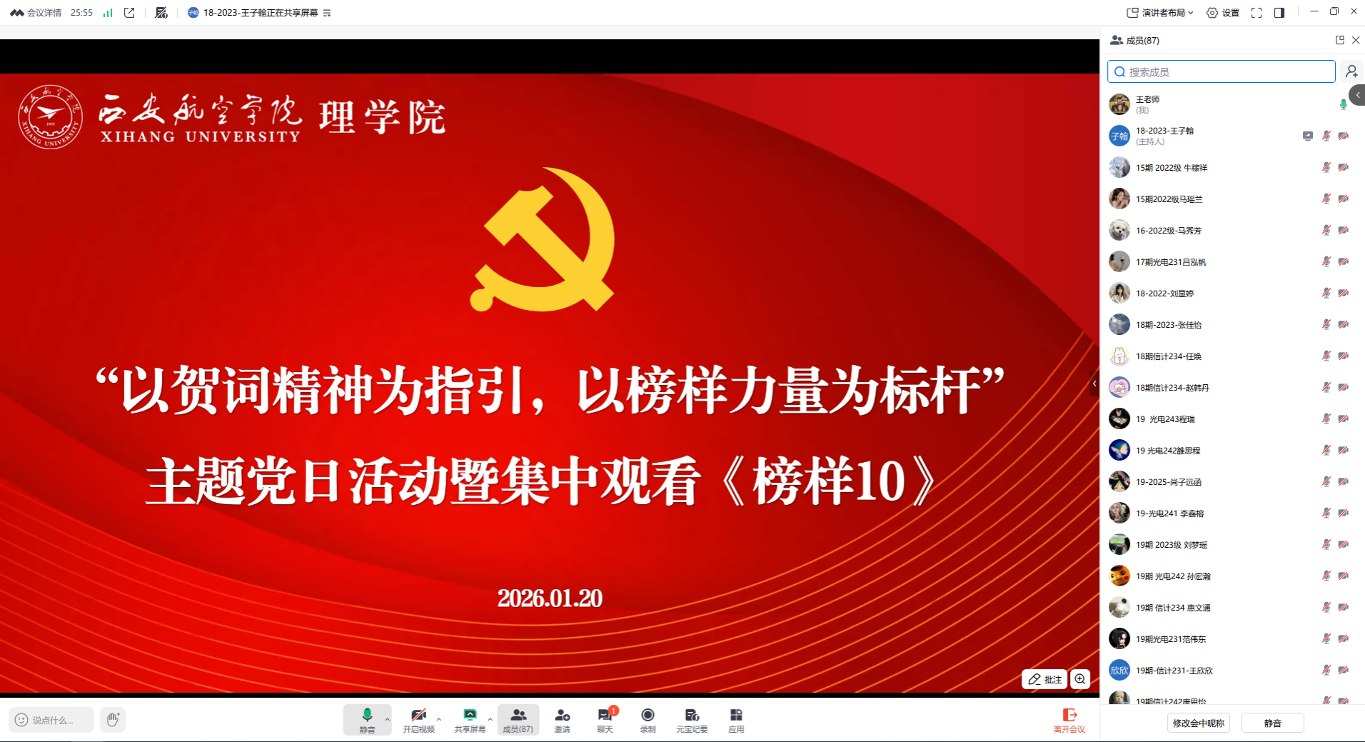 最后李扬作总结发言。她充分肯定了本次主题党日活动的意义与效果,并寄语全体学生党员:一要持续深入学习党的创新理论,筑牢思想根基;二要主动向榜样学习,将感动转化为行动,在学习科研、服务同学、奉献社会中走在前列;三要不断强化党员身份意识,锤炼过硬本领,努力成长为有理想、敢担当、能吃苦、肯奋斗的新时代好青年,为实现中华民族伟大复兴贡献青春智慧与力量。