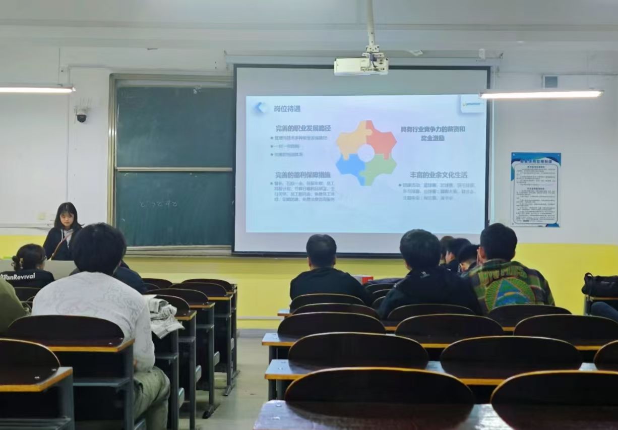 招聘会上,企业负责人通过PPT对公司的发展历程、企业文化进行了详细介绍,重点讲解了本次招聘的岗位类型,包括教学研发、课程顾问、运营管理、技术支持等,并对每个岗位的职责、要求以及未来的发展空间做了清晰的说明。同时,详细讲解了公司的培训体系和员工福利等。在互动交流环节,同学们踊跃提问,涉及工作内容的细节、职业晋升通道、团队协作模式等诸多方面,招聘人员一一进行详细解答。